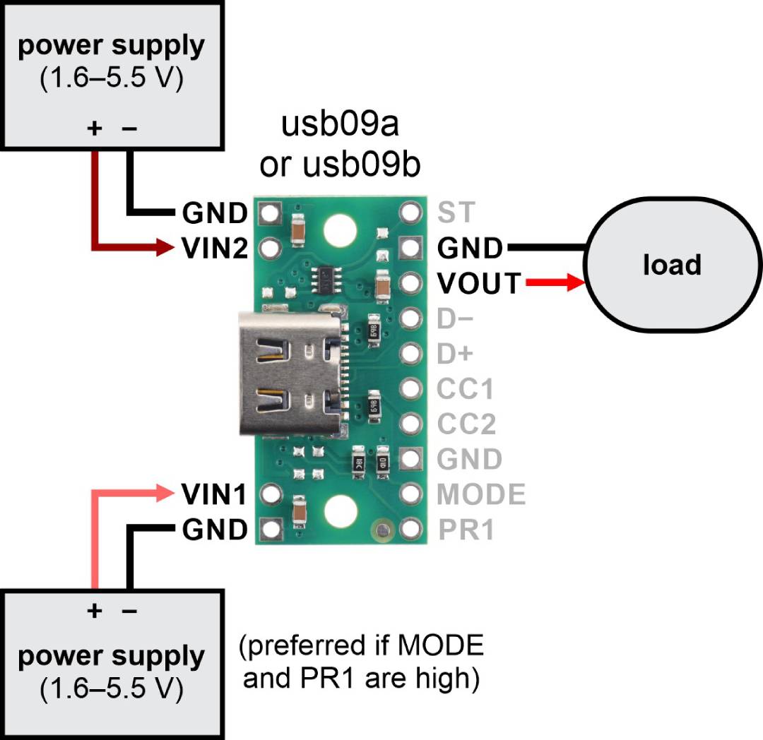 Moduł może pracować w kilku trybach, co pozwala dostosować jego działanie do aplikacji. W trybie domyślnym (MODE w stanie niskim) układ automatycznie wybiera źródło o wyższym napięciu. Dzięki temu urządzenie może być zasilane zarówno z USB, jak i zewnętrznego źródła bez konieczności ręcznego przełączania. W trybie priorytetowym (MODE i PR1 w stanie wysokim) preferowane jest wejście VIN1, czyli w tej wersji zasilanie USB typu C. W przypadku spadku napięcia poniżej ustawionego progu układ automatycznie przełączy się na wejście VIN2. Należy unikać jednoczesnego podłączania dwóch źródeł do tego samego wejścia, aby zapobiec zwarciu.