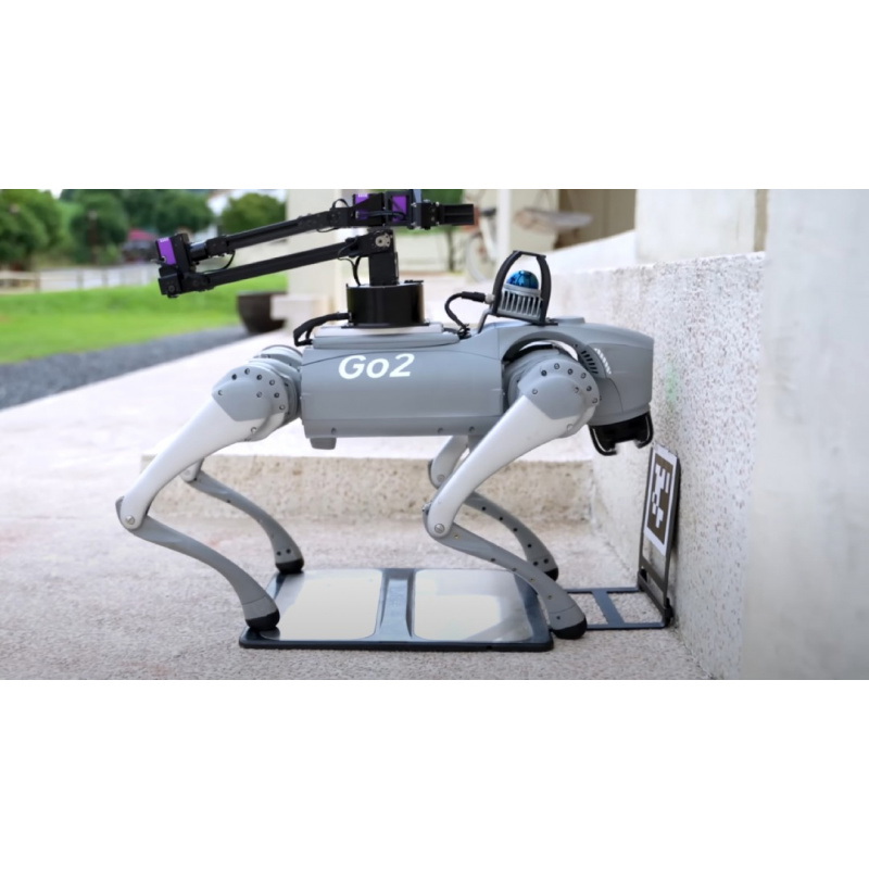 Kiedy akumulator robota wyczerpuje się, Go2 Edu lokalizuje stację i kładzie się na jej samoładującej podstawie, aby uzupełnić energię.