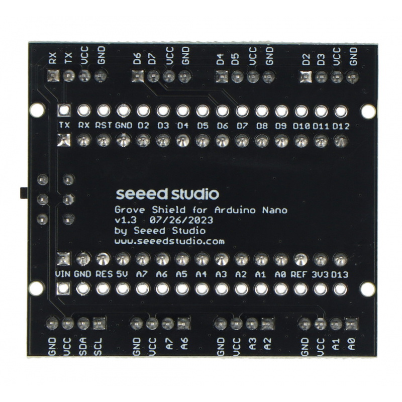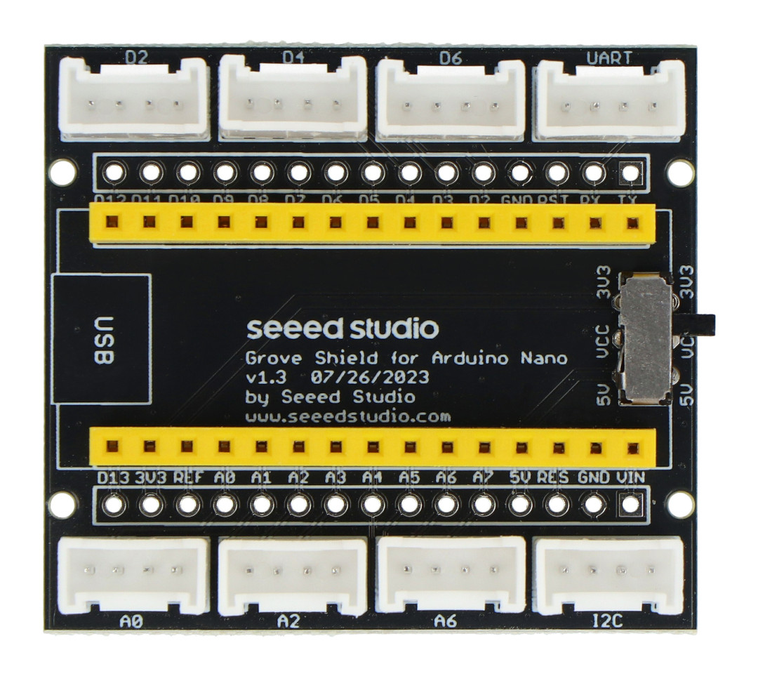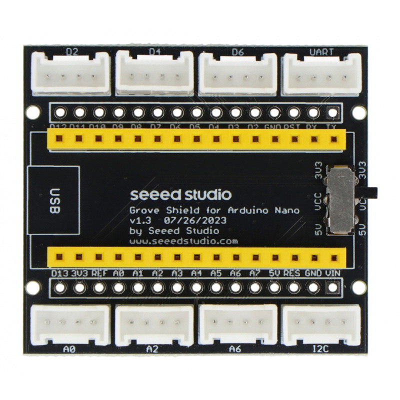 Shield dla Arduino Nano to płytka w pełni kompatybilna z Seeeduino Nano oraz Arduino Nano. Posiada 8 złączy, dzięki czemu możliwe jest podłączenie wielu urządzeń, czujników, wyświetlaczy Grove za pomocą przewodów 4-pinowych. Złącza te to UART, I2C, 3 złącza cyfrowe oraz 3 złącza analogowe. Posiada przełącznik VCC 3.3 V/5 V. Ma niewielkie rozmiary 45 mm x 40 mm.