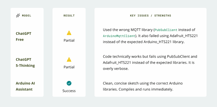 Aby to zweryfikować, firma Arduino przeprowadziła porównanie. Zestawiła Arduino AI Assistant, zintegrowane z Arduino Cloud, z dwiema wersjami ChatGPT: darmową oraz płatną „ChatGPT 5-Thinking”.