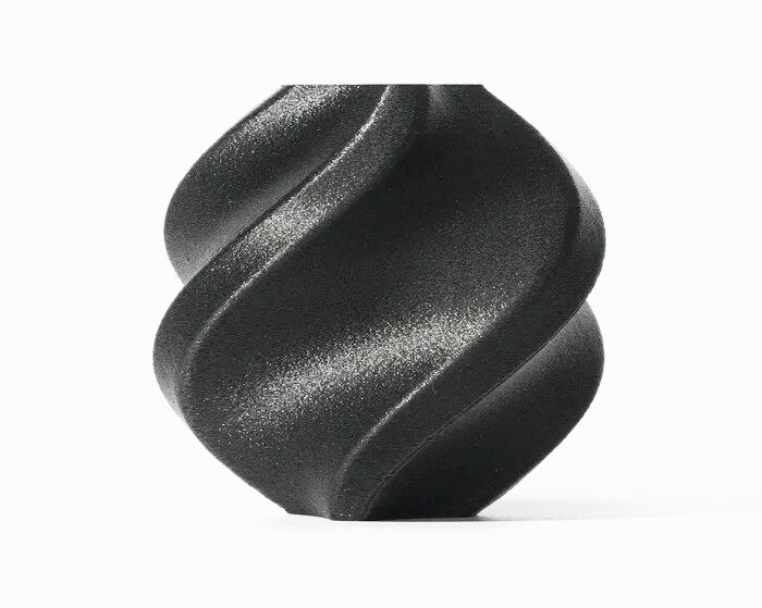 Filament Bambu Lab PAHT-CF to zaawansowany materiał kompozytowy, którego matrycę stanowi nylon PA12 o podwyższonej odporności termicznej (PA-HT). Wzmocniony jest on dodatkiem 15-20% krótkiego włókna węglowego, które pełni rolę sztywnego zbrojenia. Dzięki tej strukturze filament charakteryzuje się doskonałą wytrzymałością mechaniczną oraz stabilnością wymiarową, nawet w warunkach intensywnej eksploatacji. Materiał wyróżnia się wysoką odpornością termiczną – temperatura odkształcenia cieplnego (HDT) wynosi około 195°C przy ciśnieniu 0,45 MPa, natomiast ciągła temperatura pracy sięga 150°C. W porównaniu do klasycznych nylonów PA6 i PA12, PAHT-CF wykazuje znacznie niższą higroskopijność, co przekłada się na rzadszą konieczność suszenia i większą stabilność właściwości mechanicznych w czasie.