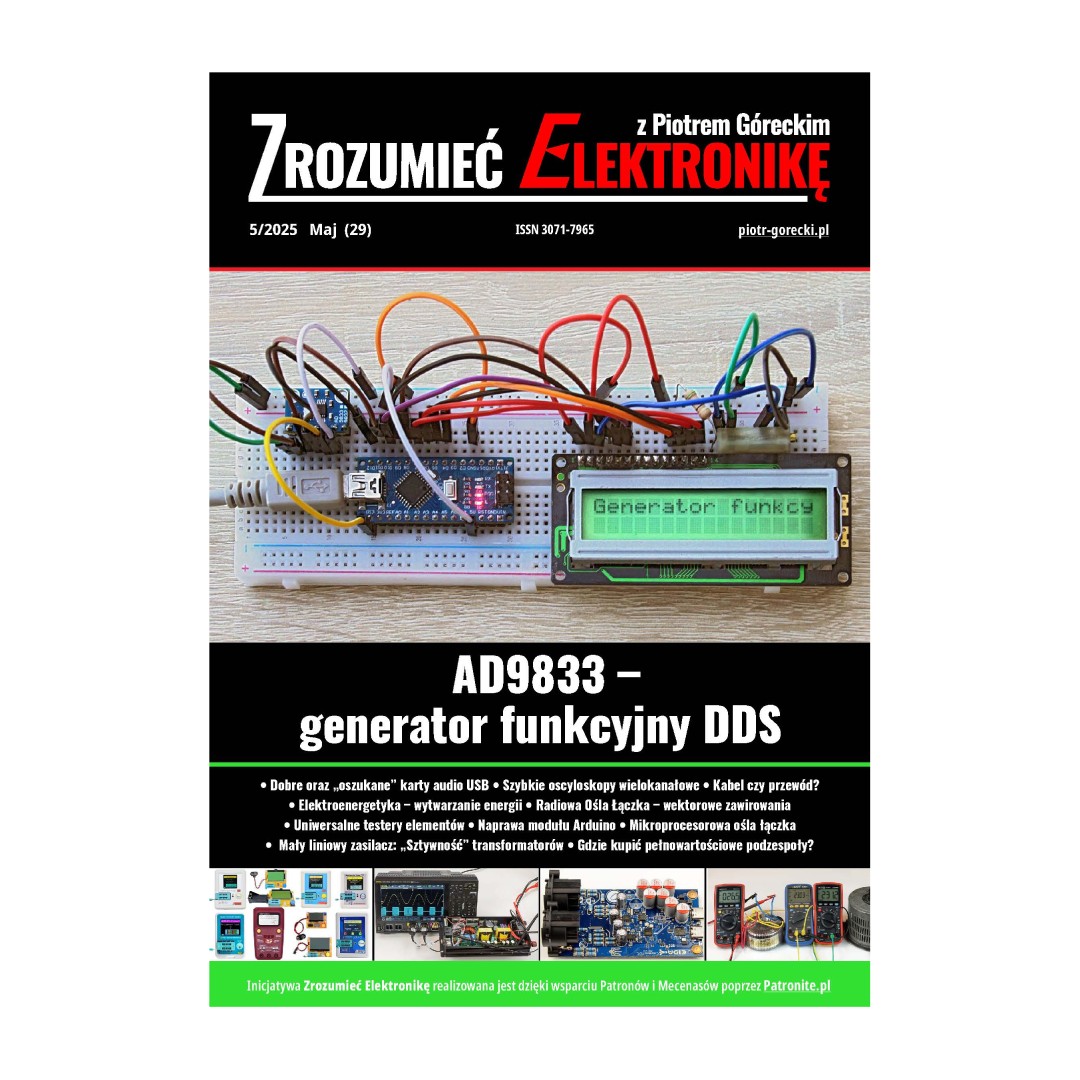 Zrozumieć Elektronikę to cyfrowy miesięcznik dla pasjonatów elektroniki, autorstwa Piotra Góreckiego. Projektem okładkowym majowego numeru ZE jest interesujący, bardzo prosty układ generatora DDS z kostką AD9833 - doskonały przykład realizacji wskazówek kursu Mikroprocesorowej Oślej Łączki. W numerze znajduje się też obszerny artykuł o uniwersalnych testerach elementów, które skrótowo przedstawione były w poprzednim numerze ZE. Artykuł "Szybkie oscyloskopy wielokanałowe" przedstawia możliwości i przykłady wykorzystania nowoczesnych oscyloskopów. W cyklu o nietypowym wykorzystaniu kart dźwiękowych warto przeczytać artykuł "Dobre oraz "oszukane" karty audio USB", a w wątku Radiowej Oślej Łączki artykuł o "wektorowych zawirowaniach". W ramach serii dotyczącej projektowania klasycznych, liniowych zasilaczy na uwagę zasługuje artykuł o słabo rozumianej kwestii "sztywności" transformatorów. W numerze jest też materiał pod znamiennym tytułem: "Gdzie kupić pełnowartościowe podzespoły?" Wbrew pozorom, nie jest to wcale tak oczywiste. Na końcu numeru zamieszczono drugą cześć artykułu Kabel czy przewód?, zawierającą kluczowe rozróżnienie tych dwóch popularnych określeń. Numer ISSN czasopisma: 3071-7965.