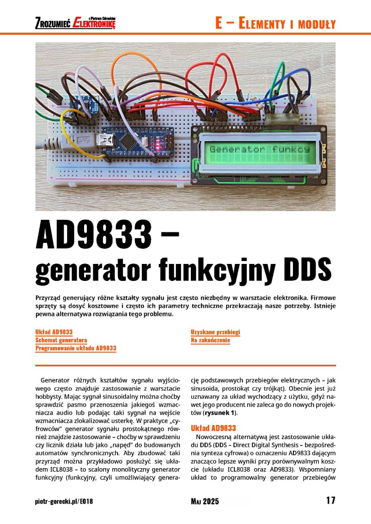 Zapraszam do lektury numeru majowego, w którym projektem okładkowym jest interesujący, w sumie bardzo prosty układ generatora DDS z kostką AD9833. Z jednej strony jest to znakomity przykład realizacji wskazówek kursu Mikroprocesorowej Oślej Łączki. Z drugiej, zaskakująco prosta realizacja aż prosi się o rozbudowę, do czego zresztą gorąco zachęca Autor. Można rozbudować program, ale jeszcze bardziej pożyteczne byłoby rozbudowanie części sprzętowej i zamknięcie jej w obudowie.