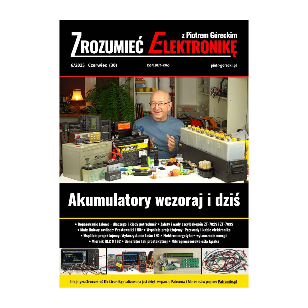 Zrozumieć Elektronikę to cyfrowy miesięcznik dla pasjonatów elektroniki, autorstwa Piotra Góreckiego. Artykuł okładkowy przedstawia zaskakująco długą historię różnych akumulatorów. Jest to wprowadzenie do ważnego cyklu, omawiającego historię najważniejszych rodzin akumulatorów: kwasowych, zasadowych oraz litowych. W ramach Radiowej Oślej Łączki w tym numerze zaczyna się seria artykułów o trzech rodzajach dopasowania: falowym, energetycznym i szumowym. W cyklu o projektowaniu zasilacza można przypomnieć sobie ważne informacje, o których często zapominamy. Dwa artykuły dotyczące miernictwa zawierają szereg pożytecznych informacji o ręcznych multimetrach Zotek oraz o pewnym amatorskim mierniku indukcyjności i pojemności. Warto też zwrócić uwagę na rozwiązanie zadania konkursowego, dotyczącego nieoczywistego problemu „kabli i przewodów”. Numer ISSN czasopisma: 3071-7965.