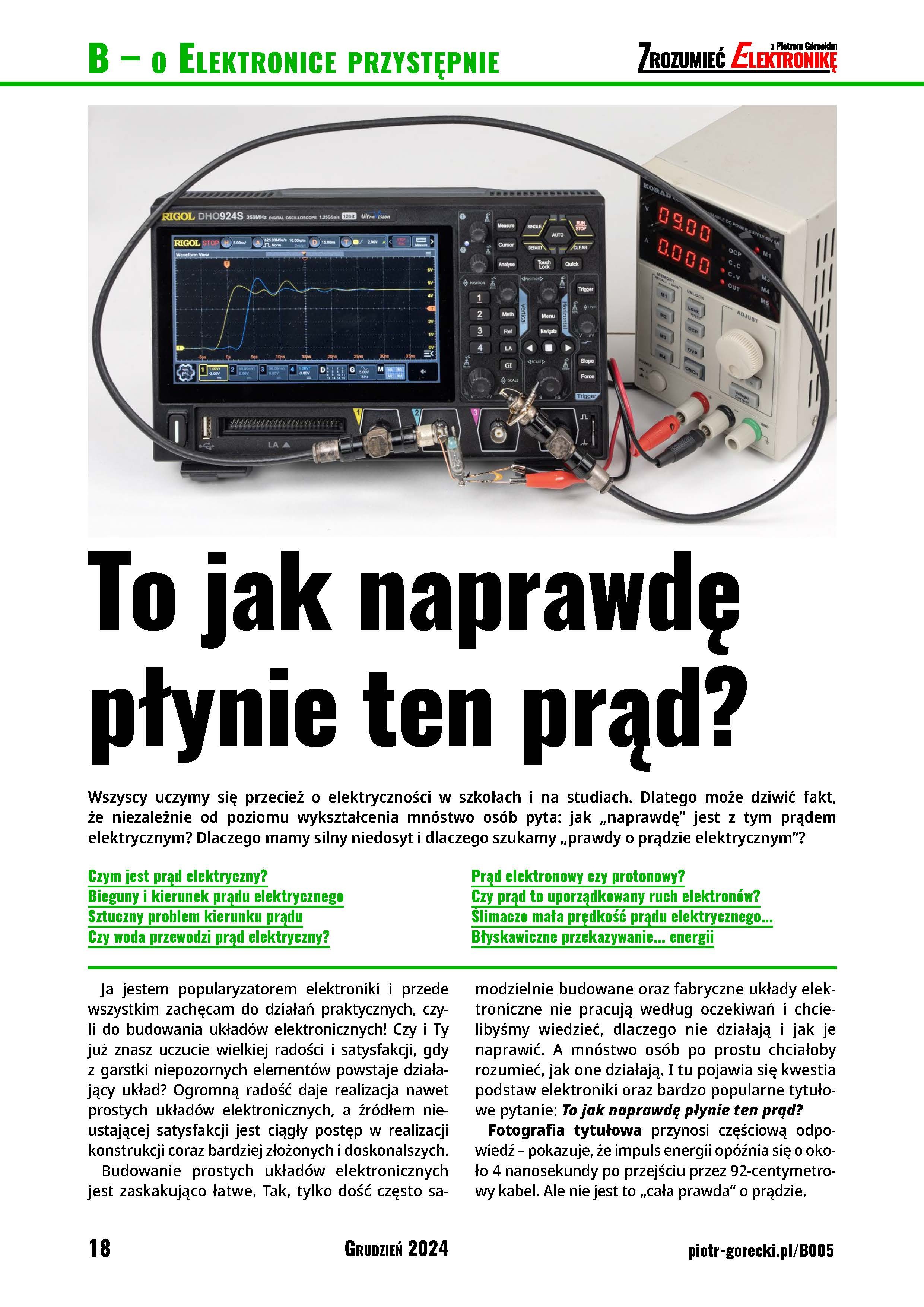 Zrozumieć Elektronikę to cyfrowy miesięcznik dla pasjonatów elektroniki, autorstwa Piotra Góreckiego. W grudniowym wydaniu znajdziesz aż cztery artykuły poświęcone tematyce Radiowej Oślej Łączki (ROŁ), której poświęcono również artykuł okładkowy pt. „To jak naprawdę płynie ten prąd?”. Temat ten rozwija tekst „Elektronika na chłopski rozum?”, który przestrzega przed uproszczeniami i ukazuje konieczność wyważonego podejścia. Zagadnienia związane z radiotechniką omawia również publikacja „Cała prawda o elektronice, czy niedoskonałe modele?”, wskazująca na ograniczenia naszej obecnej wiedzy. W tym duchu utrzymane są również kolejne dwa teksty: „Pierwiastkowe prawo Barlowa, logarytmiczne prawo Ohma...” oraz „Rezystancja materiałowa, czyli drugie prawo Ohma”. Na uwagę zasługuje także artykuł praktyczny poświęcony tajnikom efektywnego używania sond oscyloskopowych - bo dobry oscyloskop to nie wszystko. Z kolei dla majsterkowiczów przygotowano obszerny poradnik na temat wyboru lutownicy odpowiedniej dla hobbysty. W ramach cyklu Wspólnie projektujemy zaprezentowano interesujące rozwiązanie zabezpieczenia nadnapięciowego, a Mikroprocesorowa Ośla Łączka (już w siódmym odcinku) porusza praktyczne aspekty obsługi przerwań w mikrokontrolerach. Ciekawostką jest też kolejny odcinek serii o lampach elektronowych, który przybliża nietypowe, a często zagadkowe układy obciążeń występujące na schematach.