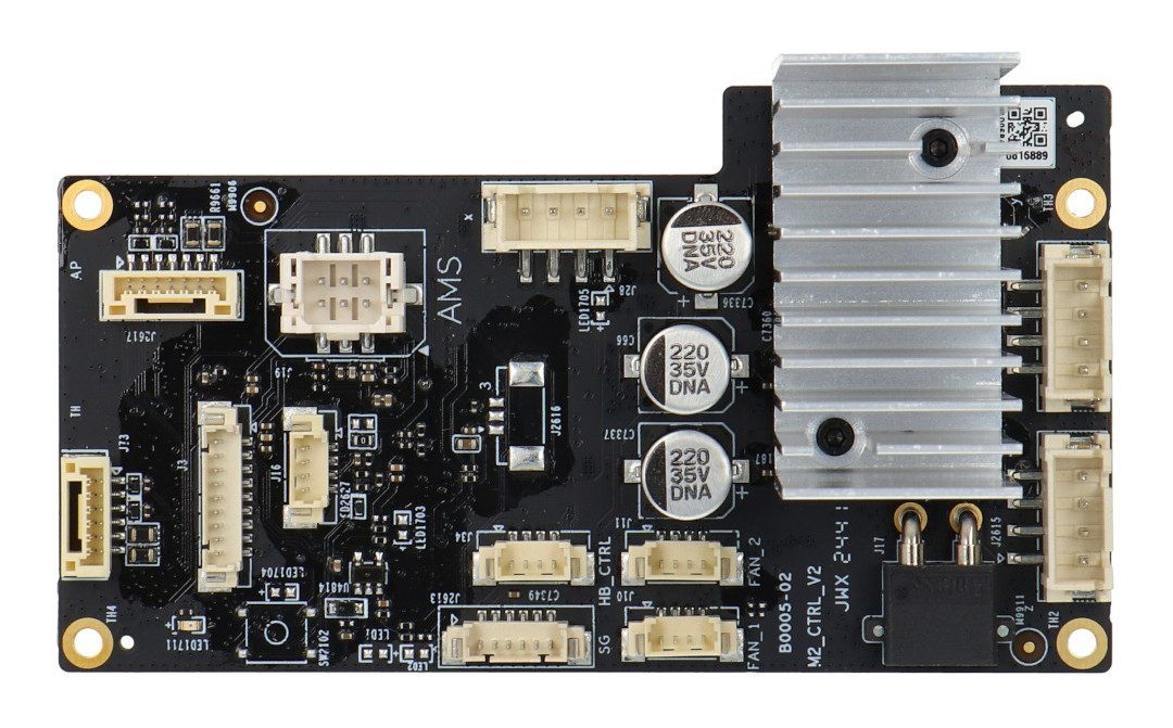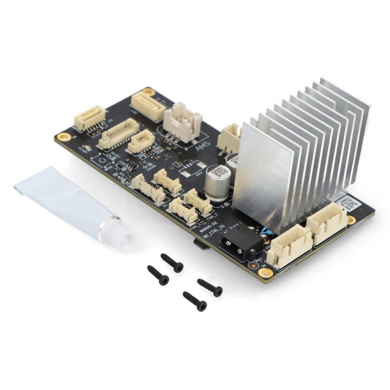 - Centralny moduł zarządzający drukarką 3D - zarządza ruchem osi XYZ, kontroluje parametry stołu grzewczego i odpowiada za komunikację z modułami peryferyjnymi, w tym systemem AMS