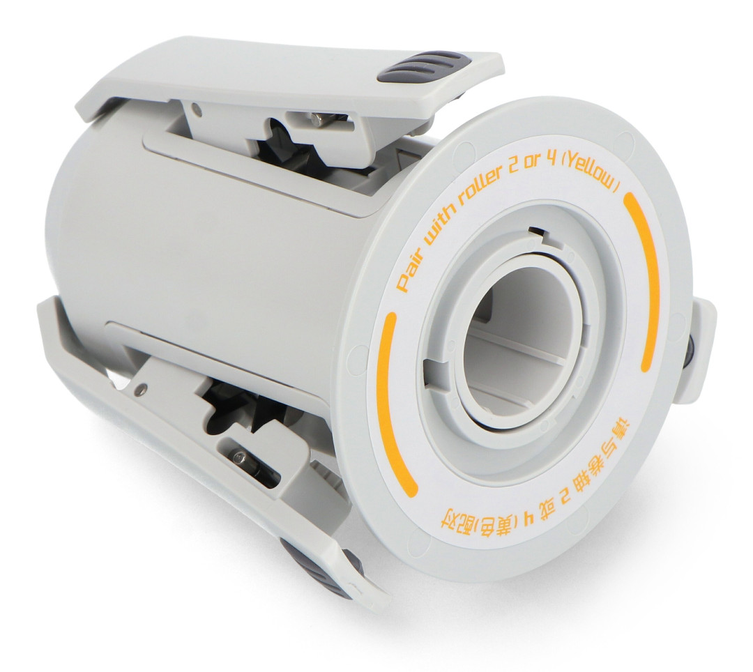 Wersja żółta uchwytu obrotowego szpuli AMS Lite, jest zaprojektowana do pracy na rolkach dolnej lewej i górnej prawej, obracających się zgodnie z ruchem wskazówek zegara. Zapewnia płynne rozwijanie filamentu do slotów 2 i 4. Trzy pazury utrzymują szpulę na miejscu, zapobiegając jej przesuwaniu się podczas pracy urządzenia. Właściwy dobór wersji kolorystycznej uchwytu jest kluczowy dla prawidłowego funkcjonowania systemu AMS Lite.