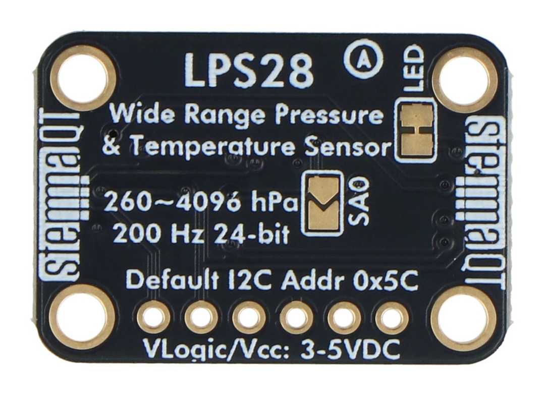 Adafruit LPS28 to nowoczesny moduł z czujnikiem LPS28DFW, wyróżniający się znacznie większym zakresem pomiarowym niż standardowe sensory barometryczne. Umożliwia pomiar ciśnienia aż do 4060 hPa, co pozwala na zastosowania w środowiskach wysokiego ciśnienia, takich jak robotyka podwodna czy projekty badawcze. Czujnik oferuje wysoką precyzję oraz niski poziom szumów, a także szybkie próbkowanie do 200 Hz. Dzięki interfejsowi I2C oraz złączom STEMMA QT / Qwiic integracja z mikrokontrolerami jest szybka i wygodna. Sensor posiada wbudowaną kompensację temperatury oraz metalowy port, który umożliwia podłączenie cienkich przewodów elastycznych do precyzyjnego badania ciśnienia. Dzięki zastosowaniu specjalnego żelu ochronnego, element pomiarowy jest odporny na wysokie ciśnienia (do 10000 hPa) oraz wybrane substancje chemiczne. Moduł współpracuje z logiką 3,3 V oraz 5 V, co czyni go w pełni uniwersalnym rozwiązaniem dla miłośników elektroniki.