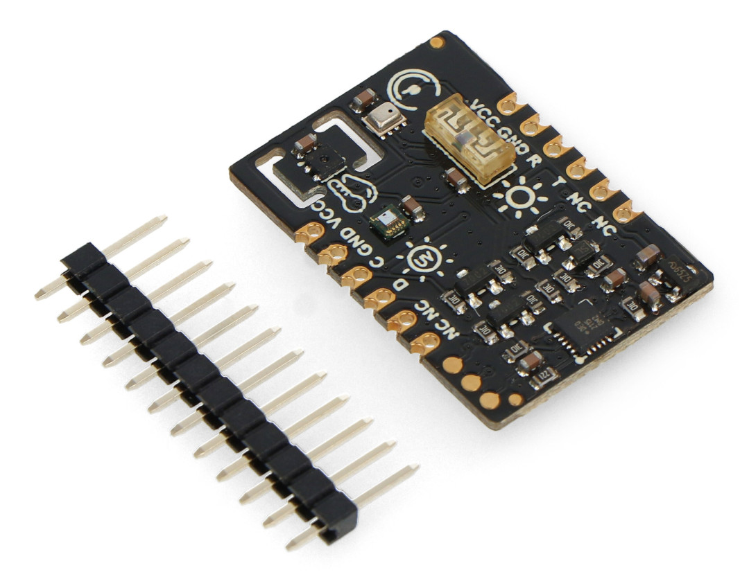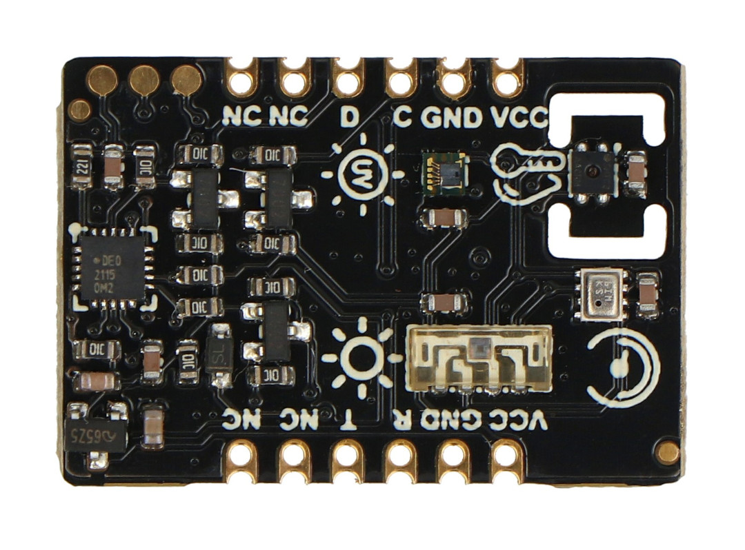 Moduł czujnika środowiskowego składa się z czujnika temperatury i wilgotności SHTC3, czujnika ciśnienia BMP280, czujnika światła otoczenia VEML7700 oraz czujnika promieniowania UV LTR390-UV-01 . Czujnik środowiskowy wykorzystuje dwa interfejsy komunikacyjne UART i I2C. Zasilany jest napięciem 3,3 V. Czujnik może być wykorzystywany do tworzenia systemów monitorowania środowiska wewnątrz i na zewnątrz.