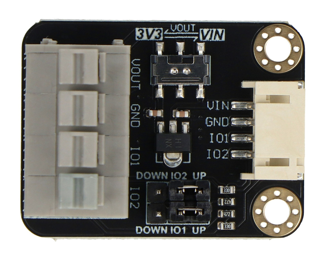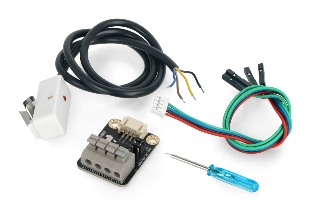 Wyprodukowany przez firmę DFRobot bezkontaktowy czujnik poziomu cieczy wyposażony we wskaźnik stanu oraz regulację czułości. Jego głównym zastosowaniem jest wykrywanie poziomu cieczy we wszelkiego rodzaju niemetalowych rur o średnicy zewnętrznej do 10 mm. Urządzenie umożliwia przesyłanie w czasie rzeczywistym informacji o stanie czujnika. W zestawie znajduje się również 4 pinowy adapter czujnika, który umożliwia bezpośrednie przesyłanie sygnału z czujnika do np. Arduino lub innego mikrokontrolera. Dzięki temu czujnikowi cieczy oraz jego szerokiemu zastosowaniu istnieje możliwość wykrywania cieczy w dystrybutorach wody, małych rurkach i rurkach perfuzyjnych. Czujnik poziomu cieczy opracowany został w oparciu o zaawansowaną technologię przetwarzania sygnału z wykorzystaniem wydajnego układu. Na pomiar czujnika nie ma wpływu grubość ścianek pojemnika, czy zanieczyszczenia oraz obecność kwasów i zasad.