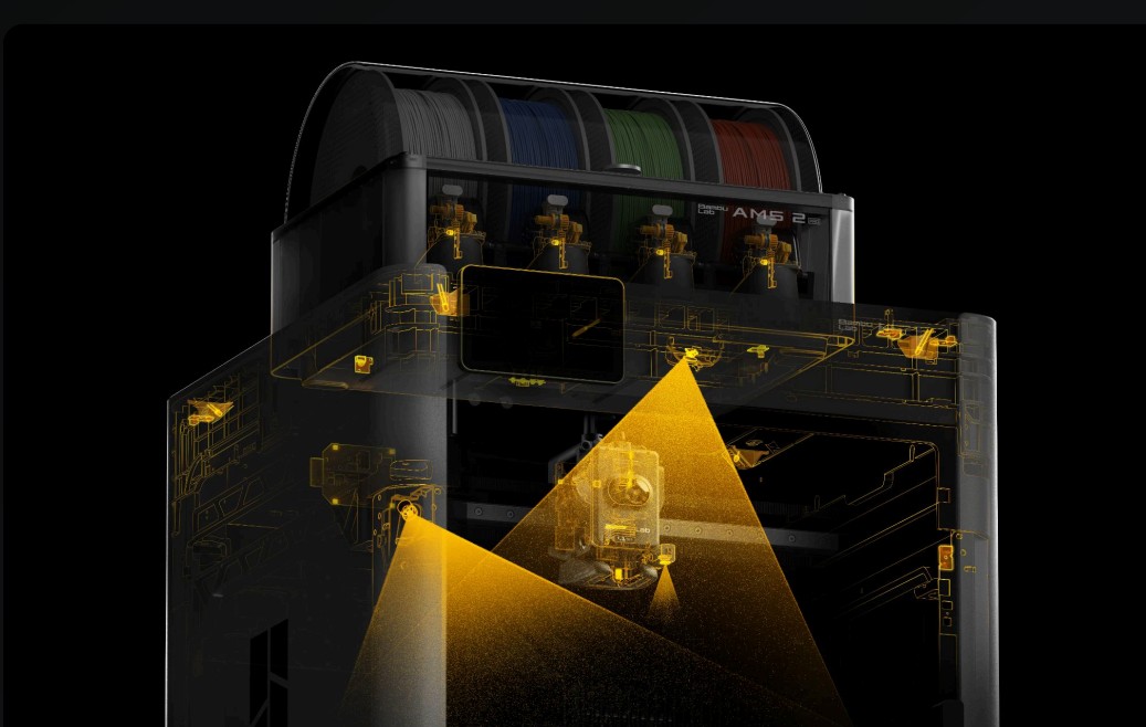 Urządzenie wykorzystuje 23 czujniki oraz 3 kamery do pełnego monitoringu procesu druku. Kamery Live View, Toolhead i Bird's Eye (opcjonalna) rejestrują parametry pracy, a AI analizuje potencjalne błędy, takie jak spaghetti, zatkania czy brak filamentu. Dzięki temu drukarka może automatycznie reagować na problemy w czasie rzeczywistym. System obejmuje również detekcję splątań i odometr filamentu (w połączeniu z AMS), zapewniając jeszcze większą kontrolę nad zużyciem materiału i jakością wydruku.