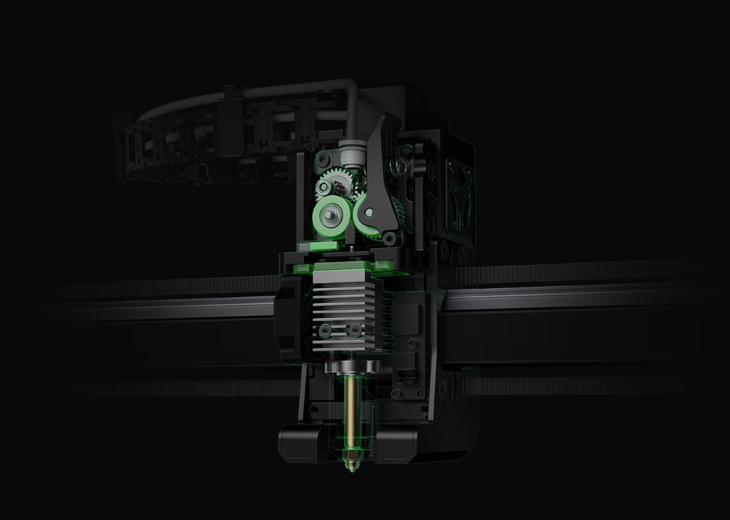 K2 Combo korzysta z trwałego ekstrudera Direct Drive o wysokim przepływie (40 mm³/s), wyposażonego w czujnik podawania filamentu oraz automatyczny nóż magnetyczny odcinający materiał. Zastosowany układ chłodzenia wspomagany wentylatorem pomocniczym poprawia adhezję międzywarstwową i stabilność wydruku. System zapewnia stały, precyzyjny przepływ materiału, co pozwala uzyskać doskonałą jakość detali nawet przy dużych prędkościach druku.