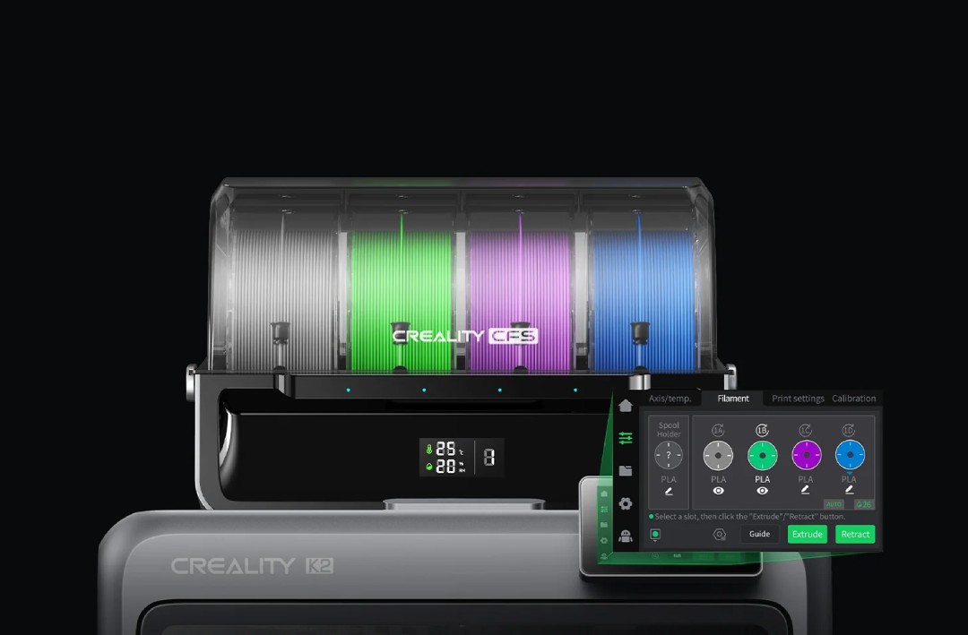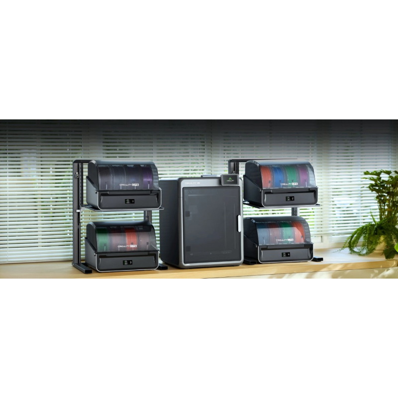Wersja Combo drukarki K2 wyposażona jest w Creality Filament System (CFS), który pozwala drukować w nawet 16 kolorach lub materiałach przy użyciu czterech modułów (1 system obsługuje 4 szpule filamentu). System automatycznie rozpoznaje filamenty dzięki wbudowanemu czytnikowi RFID oraz inteligentnie zarządza podawaniem materiału, minimalizując straty i przestoje. CFS oferuje także kontrolę wilgotności i temperatury wewnątrz komory, co chroni filamenty przed degradacją i zapewnia powtarzalną jakość wydruków.