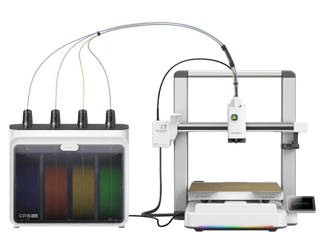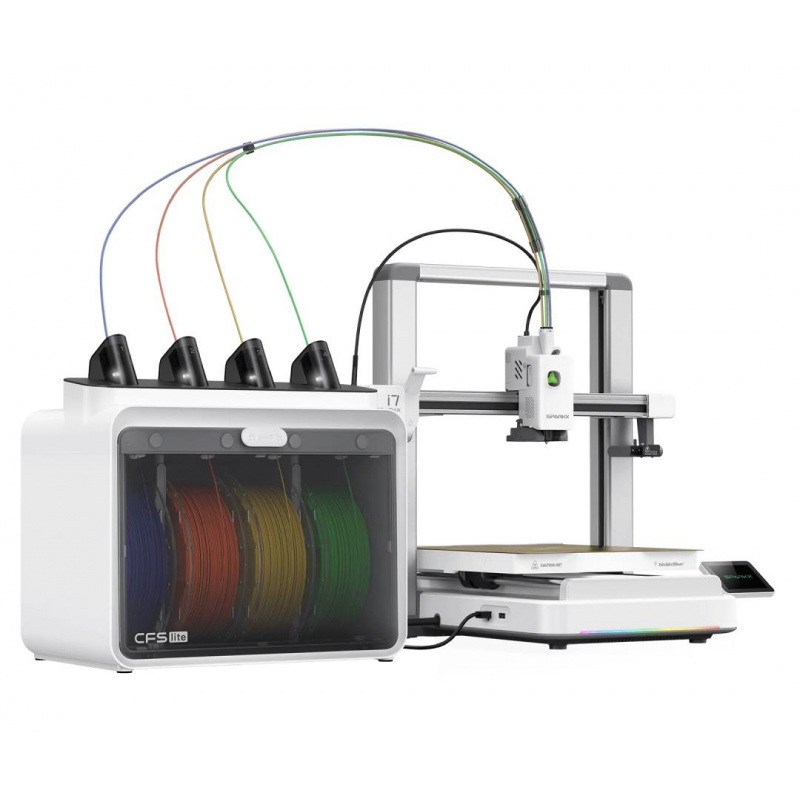 Jednym z najważniejszych wyróżników wersji Color Combo jest możliwość druku wielokolorowego - nawet w 4 kolorach jednocześnie, bez konieczności ręcznego przełączania filamentu. W zestawie znajduje się system CFS Lite, który obsługuje cztery sloty na szpule i automatycznie zarządza ich załadunkiem, suszeniem (przechowywanie z desykantem), a także identyfikacją rodzaju filamentu (w przypadku RFID). Przełączanie kolorów odbywa się płynnie i szybko, a inteligentne zarządzanie odpadami pozwala ograniczyć straty filamentu nawet o 50% w porównaniu do standardowych rozwiązań.