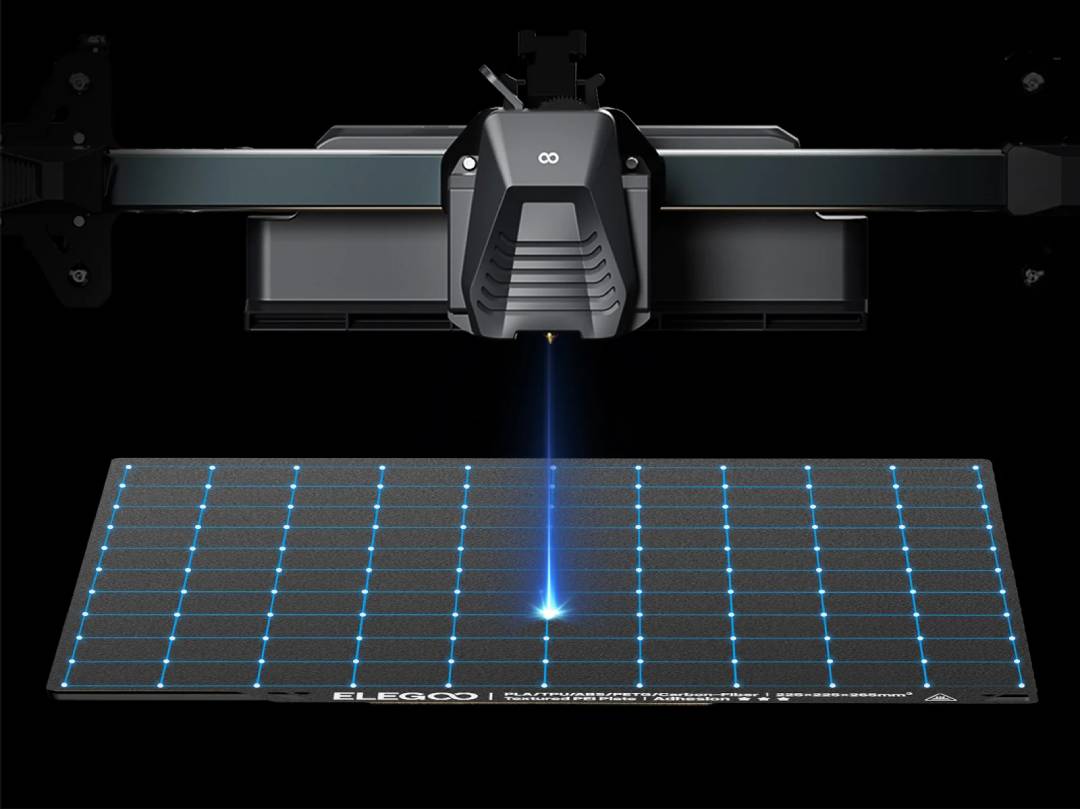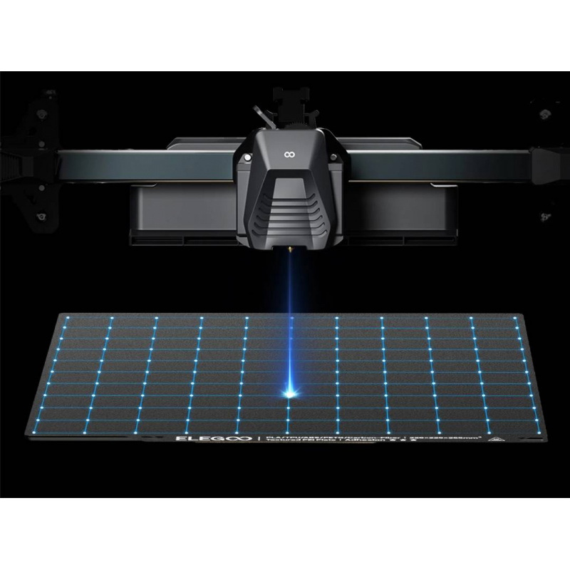 Precyzyjne poziomowanie platformy realizowane jest za pomocą systemu 121 punktów (11 x 11), co zapewnia idealne dopasowanie pierwszej warstwy do stołu. Powierzchnia robocza jest dwustronna - jedna strona została zoptymalizowana pod PLA (dla lepszej przyczepności przy niższej temperaturze), druga to teksturowane PEI, idealne do materiałów o wyższej temperaturze druku. Taka konfiguracja umożliwia łatwe dopasowanie powierzchni do aktualnie używanego filamentu. To szczególnie ważne w przypadku pracy z szeroką gamą materiałów.