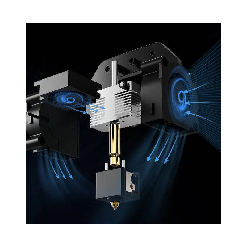 Drukarka została wyposażona w metalowy hotend z dyszą o maksymalnej temperaturze 300°C, co pozwala na druk z szerokiej gamy materiałów - od PLA, przez PETG, TPU, aż po techniczne filamenty jak ABS, ASA i nylon. Ekstruder typu direct drive z przełożeniem 5.2:1 i podwójnym napędem zapewnia pewne podawanie materiału i minimalizuje ryzyko zapychania się dyszy. Dodatkowo, bi-metalowa rurka grzewcza z miedzi i tytanu gwarantuje szybkie odprowadzanie ciepła oraz wysoką odporność na zużycie. Całość jest zoptymalizowana także pod kątem filamentów elastycznych.