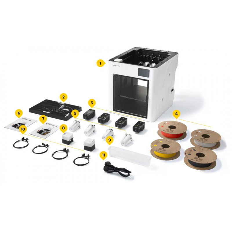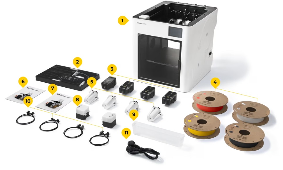 Każda głowica blokowana jest za pomocą precyzyjnych sprzęgieł kulkowych, które przeszły ponad 1 000 000 cykli testowych bez awarii. Konstrukcja drukarki wykonana jest z trwałych, sztywnych materiałów, co zapewnia stabilność i jakość nawet przy bardzo szybkich wydrukach. U1 jest dostarczana z bogatym zestawem startowym - w tym 4 głowice, 4 szpule PLA, uchwyty, przewody i narzędzia. To kompletne, gotowe do działania urządzenie, stworzone z myślą o długoterminowej pracy bez zbędnych przestojów.