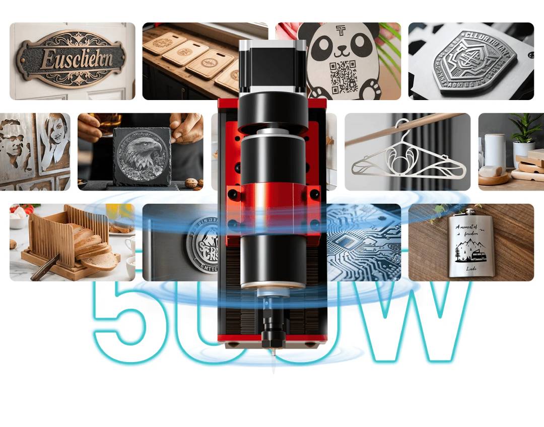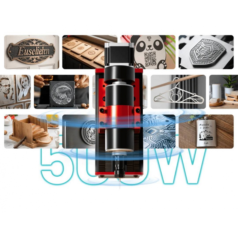Sercem maszyny jest standardowe wrzeciono o mocy 500 W, osiągające prędkość obrotową od 8000 do 30000 obr./min w zależności od konfiguracji. Dzięki dużej mocy możliwe jest efektywne frezowanie metali miękkich, takich jak aluminium czy miedź, a także cięcie materiałów organicznych jak drewno, skóra czy bambus. Obsługiwane średnice narzędzi od 0,5 mm do 7 mm (ER11) umożliwiają wykorzystanie zarówno cienkich frezów do precyzyjnych detali, jak i grubszych końcówek do szybkiego usuwania materiału. Zwiększona wydajność wrzeciona - do 40% wyższa niż w wersjach standardowych - wpływa na skrócenie czasu realizacji projektu.