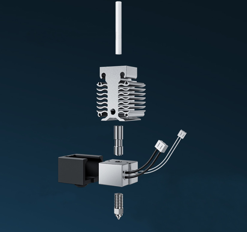 - Materiał wykonania: teflonowa tuba, niklowana dysza ze stopu miedzi, silikonowa osłona, aluminiowy blok grzewczy