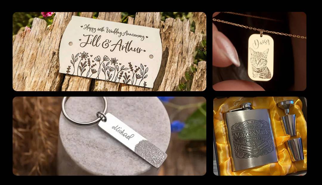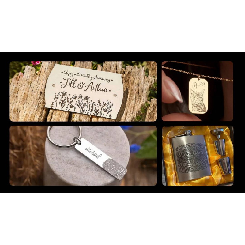 - Obsługiwane materiały: złoto, srebro, platyna, aluminium, tytan, mosiądz, żelazo, stal nierdzewna, stal, plastik, ciemny nieprzezroczysty akryl, metal galwanizowany, łupek, podkładki ceramiczne
