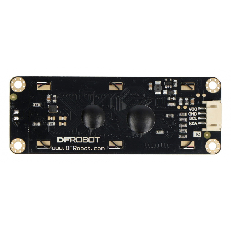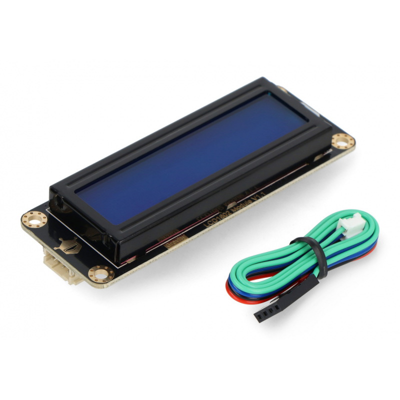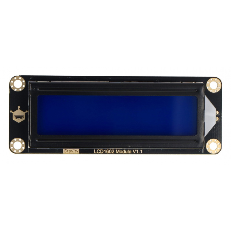 Wyświetlacz LCD 2x16 znaków z podświetleniem w kolorze niebieskim. Komunikuje się za pomocą dwuprzewodowej magistrali I2C. W zestawie znajduje się przewód przystosowany do nakładki DFRobot Gravity IO Expansion Shield.