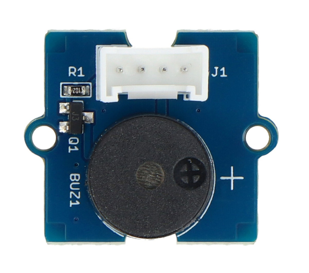 Moduł z buzzerem aktywnym z serii Grove. Emituje jednostajny ton po podaniu stanu wysokiego. Przy wykorzystaniu PWM może generować różne dźwięki i efekty. Zasilany napięciem od 3,3 V do 5 V. Odpowiedni przewód do połączenia z Seeedstudio Base Shield v2.0 można nabyć osobno.