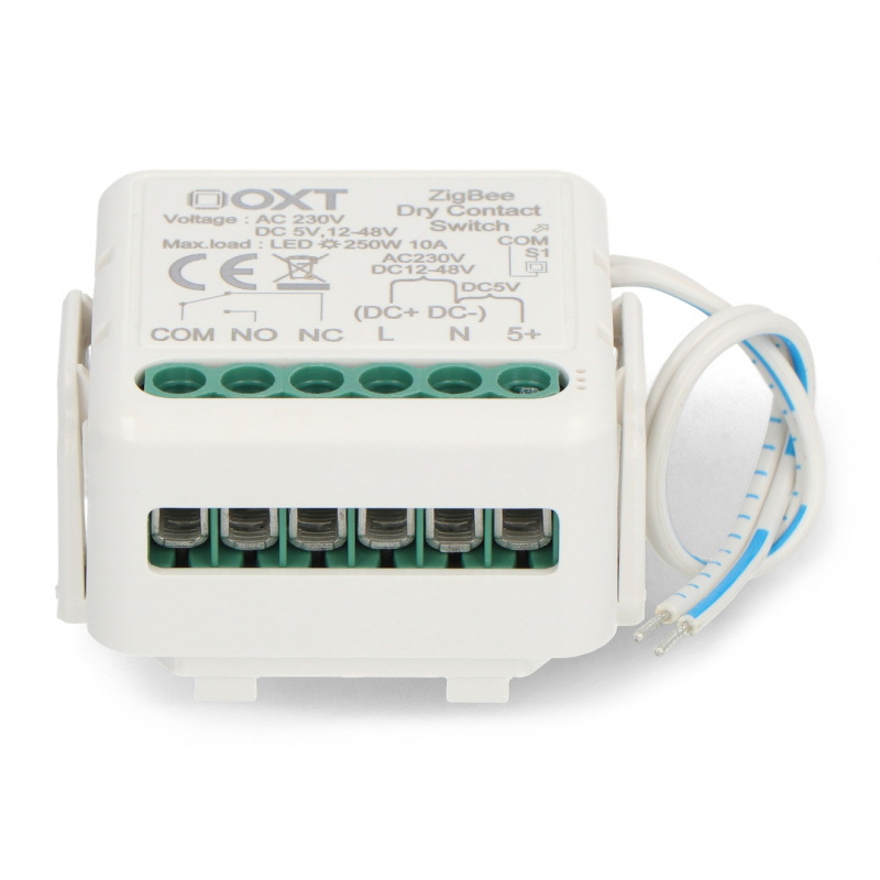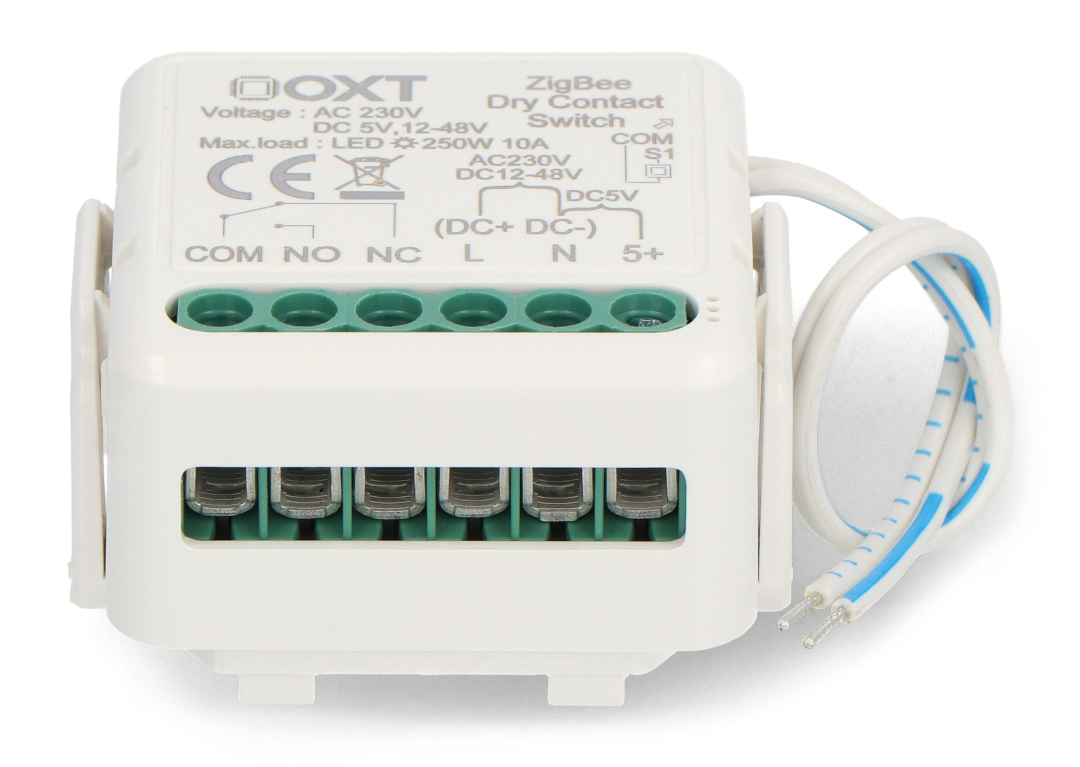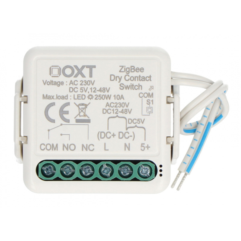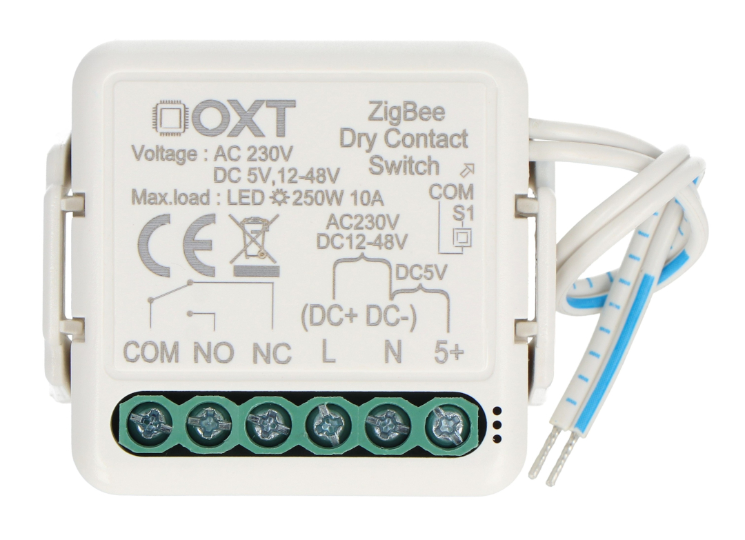 Jednokanałowy mini przekaźnik beznapięciowy od firmy OXT wyposażony w technologię ZigBee. Sprawdzi się przy różnych zastosowaniach, takich jak sterowanie beznapięciowe, oświetleniem, bramami czy siłownikami. Może działać zarówno z aplikacją jak i jako przełącznik monostabilny, bistabilny lub z opcją synchronizacji przycisków. Posiada porty NC oraz NO, które zwiększają elastyczność konfiguracji z różnymi urządzeniami. Współpracuje z darmową aplikacją Tuya Smart, dzięki której możliwe jest tworzenie inteligentnych scenariuszy w zależności od godziny, warunków pogodowych czy położenia słońca na niebie, we współpracy z innymi urządzeniami podłączonymi do tej samej sieci.