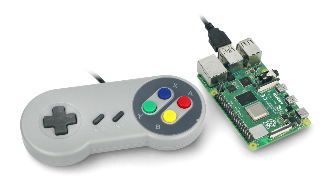 Kontroler przewodowy do komputera PC oraz minikomputera Raspberry Pi imitujący klasyczny kontroler z konsoli Super Nintendo. Posiada 8 przycisków funkcyjnych oraz 4 przyciski kierunkowe. Komunikuje się za pomocą złącza USB. W naszej ofercie można znaleźć obudowę dla Raspberry Pi o wyglądzie konsoli SNES.