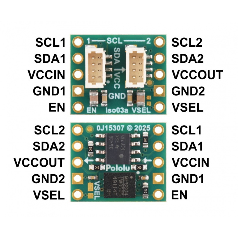 Izolator I2C marki Pololu z galwaniczną izolacją sygnałów i separowanym zasilaniem, oparty na układzie TI ISO1640, pozwala na bezpieczną, dwukierunkową komunikację I2C między dwoma urządzeniami. Obsługuje sygnały SDA i SCL z możliwością clock stretching. Dodatkowo moduł zapewnia izolowane i regulowane zasilanie 5 V (domyślnie) lub 3,3 V, które można wybrać za pomocą pinu VSEL. Izolacja chroni przed przenikaniem nieprawidłowych napięć i zabezpiecza podłączone urządzenia przed uszkodzeniem. Moduł wyposażono w złącza JST SH 4-pin kompatybilne z systemami Sparkfun Qwiic i Adafruit STEMMA QT, co ułatwia integrację z popularnymi platformami.