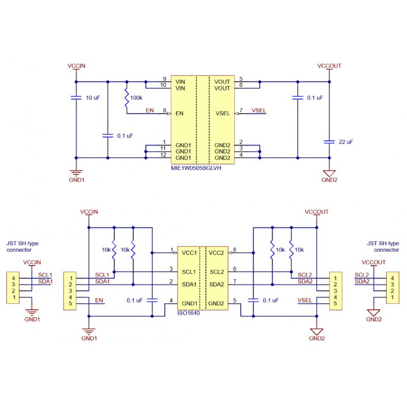 Moduł posiada dwa odrębne układy zasilania: wejściowy (VCCIN, GND1) i wyjściowy (VCCOUT, GND2), które są galwanicznie izolowane. Pin VSEL pozwala na wybór napięcia wyjściowego (5 V domyślnie lub 3,3 V po połączeniu z GND2). Wejścia SDA1 i SCL1 łączą się z magistralą I2C pierwszego urządzenia, a SDA2 i SCL2 z drugiego. Pin EN umożliwia włączanie i wyłączanie modułu, a wewnętrzne rezystory podciągające 10 kΩ zapewniają stabilność sygnałów.