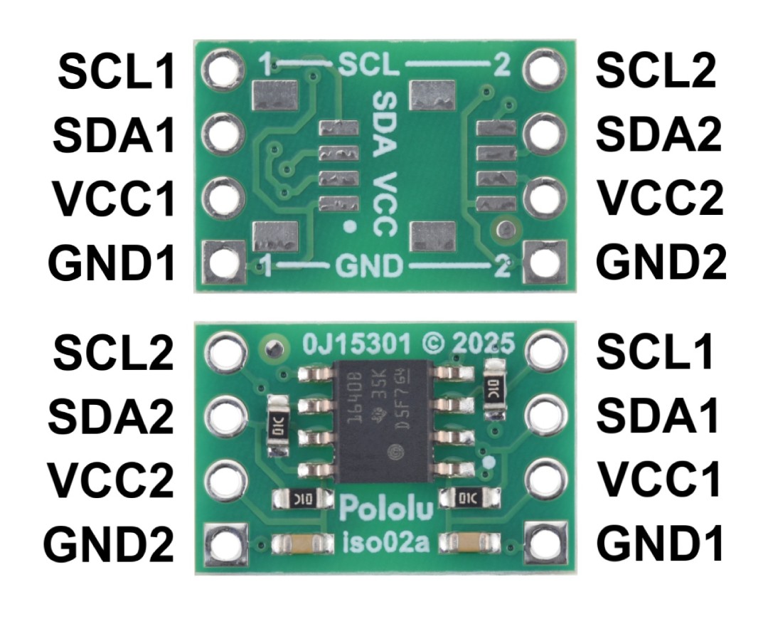 Moduł posiada otwory lutownicze rozmieszczone co 0,1'' (2,54 mm) pozwalające na podłączenie przy użyciu standardowych złącz goldpin lub lutowanie przewodów bezpośrednio. Strona 1 modułu (VCC1, GND1, SDA1, SCL1) i strona 2 (VCC2, GND2, SDA2, SCL2) są niezależne elektrycznie i wymagają oddzielnego zasilania. Wyprowadzenia umożliwiają łatwe podłączenie do dowolnych urządzeń I2C po obu stronach izolatora.