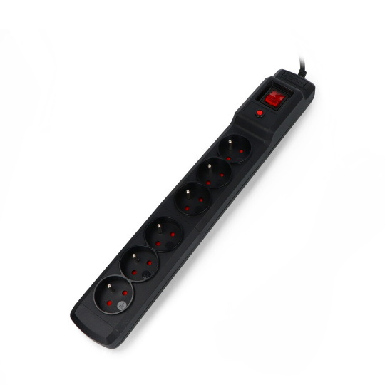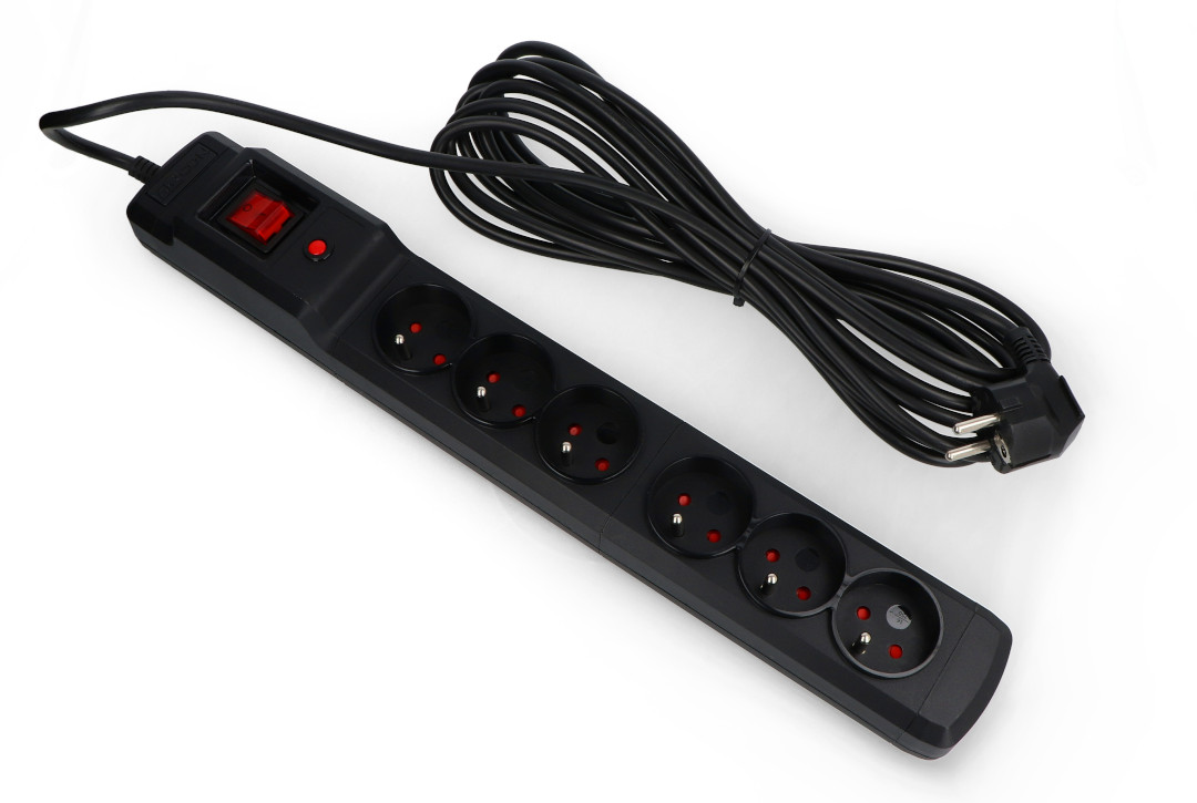 Listwa zasilająca marki Arcon wyposażona w 6 gniazd typu E. Listwa w kolorze czarnym, posiada przewód o długości 5 m. Produkt posiada zabezpieczenia przed zwarciem oraz skokami napięć. Został wyposażony także w podświetlany wyłącznik główny pozwalający na szybkie przerwanie zasilania podłączonych urządzeń.