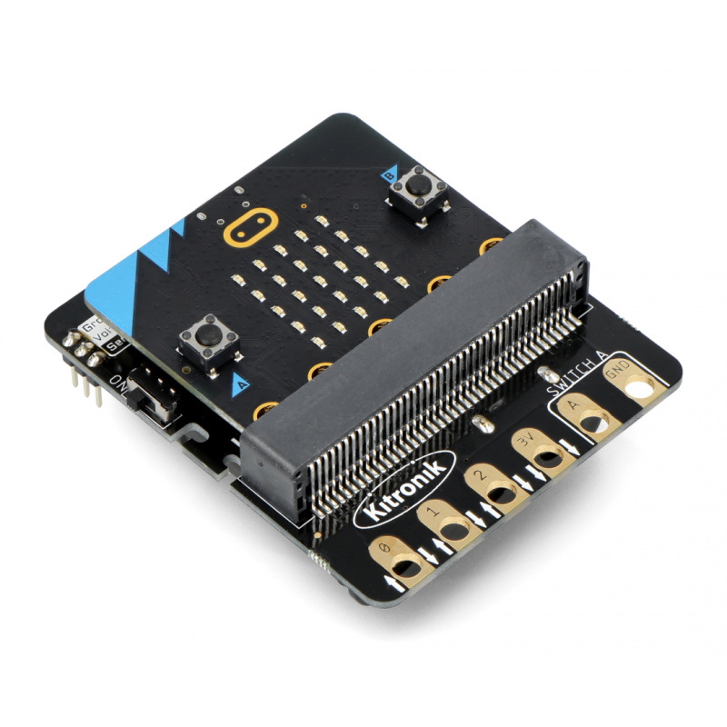 - Prosty interfejs dla BBC micro:bit - nakładka została wyposażona w specjalne gniazdo do wpięcia płytki
