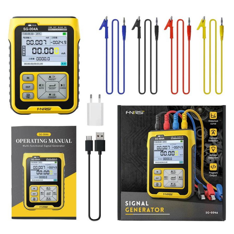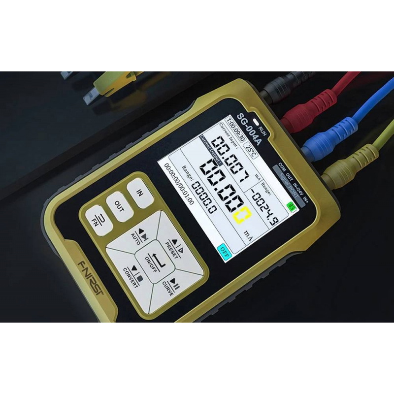 FNIRSI SG-004A to kompaktowy, wielofunkcyjny generator sygnałów zaprojektowany z myślą o inżynierach automatyki i technikach utrzymania ruchu. Urządzenie umożliwia generowanie oraz pomiar sygnałów w standardach stosowanych w przemyśle - od 0 mA do 24 mA, od 0 V do 24 V, od 0 Hz do 9999 Hz, a także sygnałów mV, rezystancyjnych i termoparowych. Model SG-004A wyróżnia się funkcją real-time curve, która pozwala na podgląd zmian sygnału wejściowego i wyjściowego w czasie rzeczywistym oraz zapis historii pomiarów. Obsługa protokołu Modbus, tryb programowalny oraz możliwość aktualizacji firmware przez USB znacząco zwiększają funkcjonalność urządzenia. Dzięki niewielkim wymiarom i solidnej obudowie z ABS z silikonowym zabezpieczeniem, generator sprawdzi się zarówno w warsztacie, jak i podczas pracy w terenie.