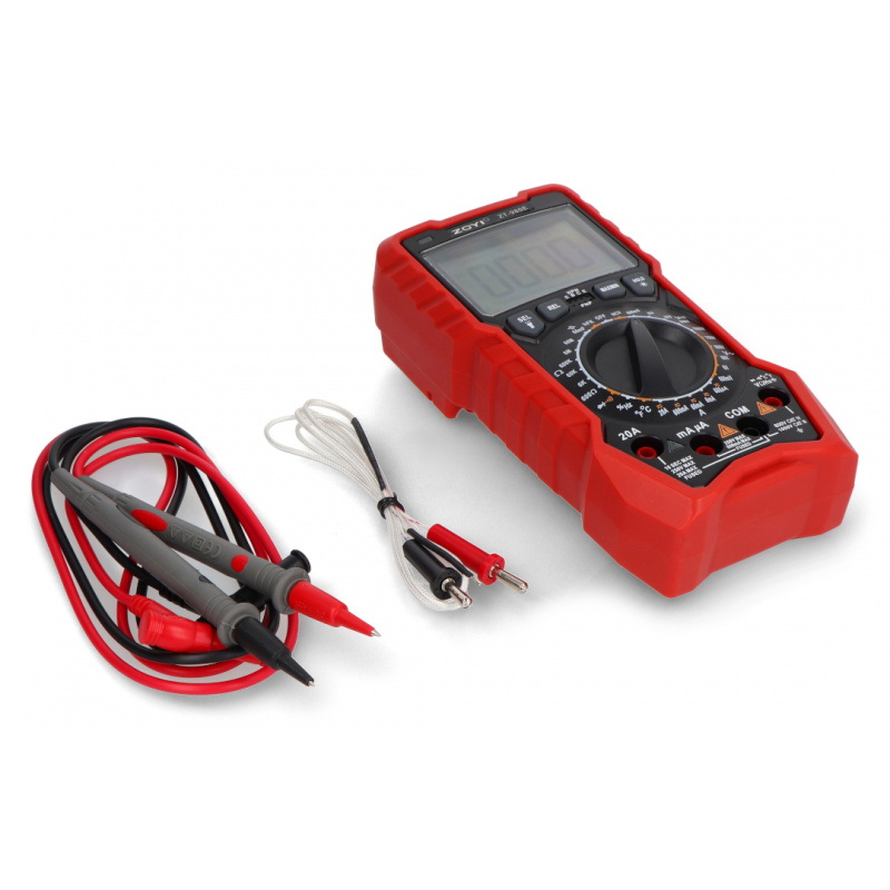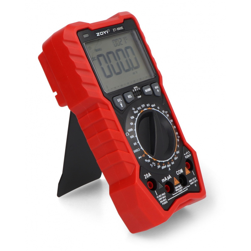 Multimetr ZOYI ZT-980 to wszechstronny miernik cyfrowy z ręczną zmianą zakresów, wyposażony w funkcję True RMS oraz filtr VCF, co zapewnia precyzyjne pomiary napięcia i prądu, nawet przy zniekształconych sygnałach do 1 kHz. Umożliwia dokładny odczyt wartości napięcia AC/DC, prądu AC/DC, rezystancji, pojemności, częstotliwości, współczynnika wypełnienia oraz temperatury w zakresie od -20°C do 1000°C. Obsługuje testy diod, tranzystorów i ciągłości obwodu. Dzięki funkcji NCV, bezkontaktowo wykrywa przewody pod napięciem, zwiększając bezpieczeństwo pracy. Duży, podświetlany wyświetlacz LCD, latarka, funkcja HOLD, MAX/MIN oraz REL, a także rozkładana podstawka i miejsce na sondy czynią ZT-980 niezwykle funkcjonalnym narzędziem dla każdego elektronika i majsterkowicza.