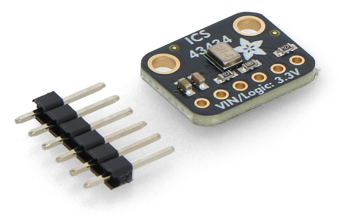 Mikrofon ICS43434 to ultracienki cyfrowy mikrofon MEMS z interfejsem I2S, który przetwarza dźwięk bezpośrednio na dane cyfrowe, eliminując potrzebę analogowej konwersji i minimalizując zakłócenia. Zakres częstotliwości od 50 Hz do 15 kHz i wbudowany filtr dolnoprzepustowy zapewniają czysty dźwięk. Dzięki cyfrowemu wyjściu I2S, mikrofon obsługuje trzy sygnały: Clock, Data oraz Word Select, umożliwiając łatwe podłączenie do mikrokontrolerów z układami serii Cortex M (SAMD21, SAMD51, ESP32, RP2040, RP2350) lub minikomputerów, takich jak Raspberry Pi. Użytkownik może wybrać kanał (lewy / prawy) za pomocą pinu Select, a przy użyciu dwóch mikrofonów można uzyskać pełne stereo. Mikrofon ma port dolny - otwór mikrofonu należy skierować w stronę źródła dźwięku. Pracuje w zakresie napięcia od 1,6 V do 3,6 V i nie jest przeznaczony do logiki 5 V. Moduł zapewnia natychmiastowe wyjście 24-bitowe bez konieczności konfiguracji firmware’u czy sterowników.
