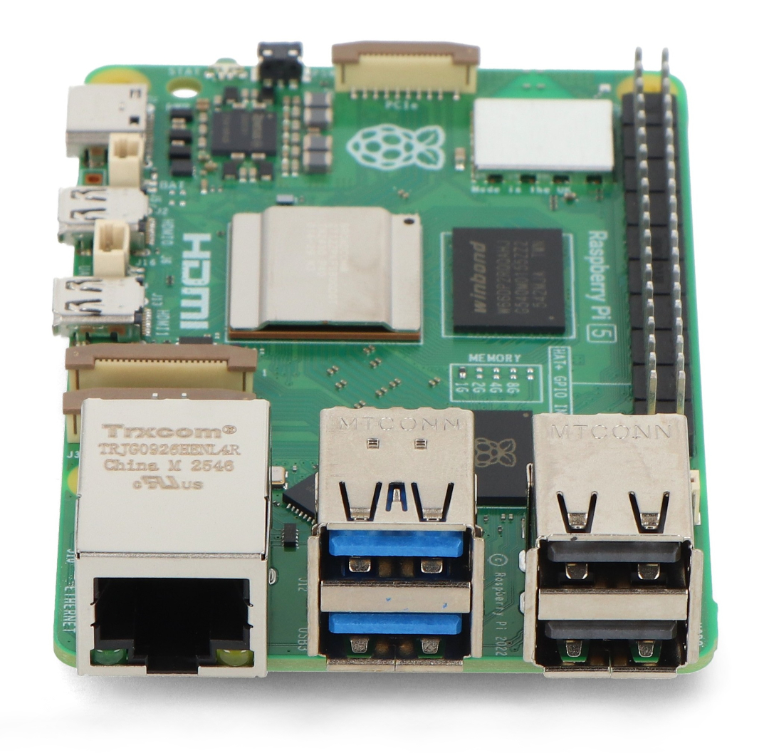 Raspberry Pi 5 w wersji wyposażonej w 1 GB pamięci RAM LPDDR4X-4267, działa na czterordzeniowym procesorze Broadcom BCM2712 ARM Cortex-A76 64-bit z częstotliwością 2,4 GHz. Piąta odsłona popularnej malinki oferuje wydajność nawet 2-3 razy większą niż Raspberry Pi 4. W standardowym wyposażeniu znajdziemy dwa złącza microHDMI, dwa porty USB 3.0, dwa USB 2.0 oraz złącze zasilania USB C. Dodatkowo Raspberry Pi 5 posiada dwa interfejsy MIPI DSI / CSI dla kamer i wyświetlaczy, złącze PCI Express 2.0, miejsce na wentylator, złącze UART, gniazdo na baterię RTC oraz dedykowany przycisk zasilania. Malina wyposażona została również w dwuzakresowe WiFi (2,4 GHz i 5 GHz), Bluetooth 5 BLE oraz gigabitowy port Ethernet 1000 Mb/s z obsługą zasilania PoE przy użyciu nakładki PoE+ HAT. Płytka zachowuje standardowe 40-pinowe złącze GPIO (2x20 pin, raster 2,54 mm) oraz slot na kartę pamięci microSD, który obsługuje system operacyjny. Obok typowych otworów montażowych przewidziano miejsce na instalację oficjalnego radiatora z wentylatorem, co dodatkowo zwiększa możliwości chłodzenia podczas intensywnej pracy.