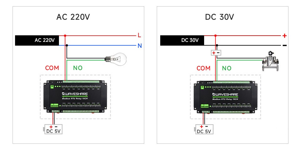 Moduł zasilany jest napięciem 5 V DC. Komunikacja z innymi urządzeniami odbywa się przez interfejs RS485. Podłączenie urządzeń zewnętrznych (np. silników, pomp, oświetlenia) odbywa się za pomocą zacisków COM i NO. Moduł umożliwia sterowanie urządzeniami o napięciu do 250 V AC lub 30 V DC, a jego przekaźniki pozwalają na obciążenie do 10 A na kanał. Podłączenie kilku modułów do jednej magistrali RS485 jest możliwe dzięki funkcji kaskadowania urządzeń, co pozwala na sterowanie większą liczbą urządzeń przy minimalnym użyciu okablowania.