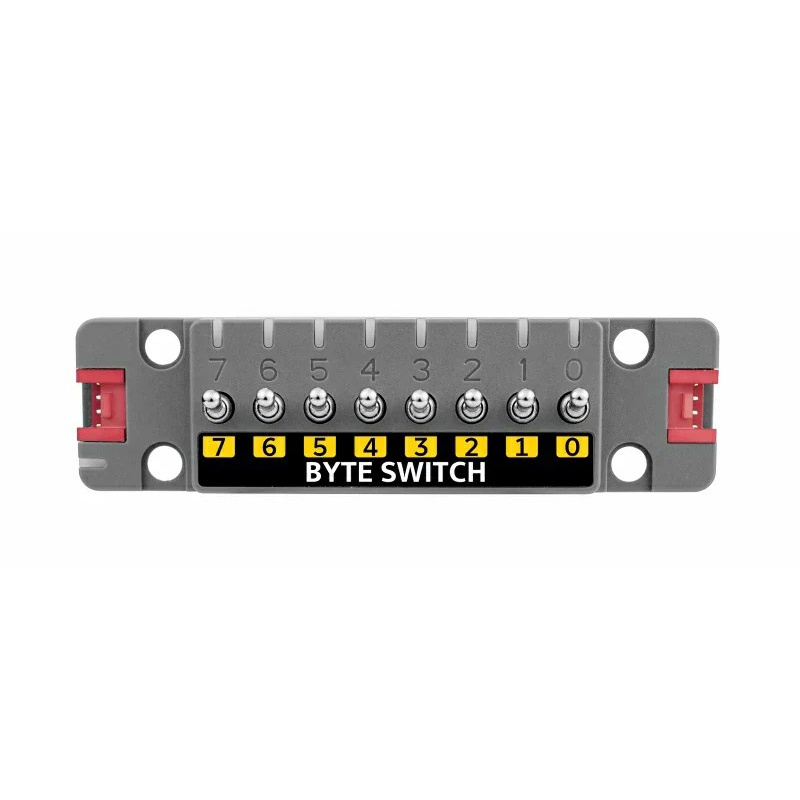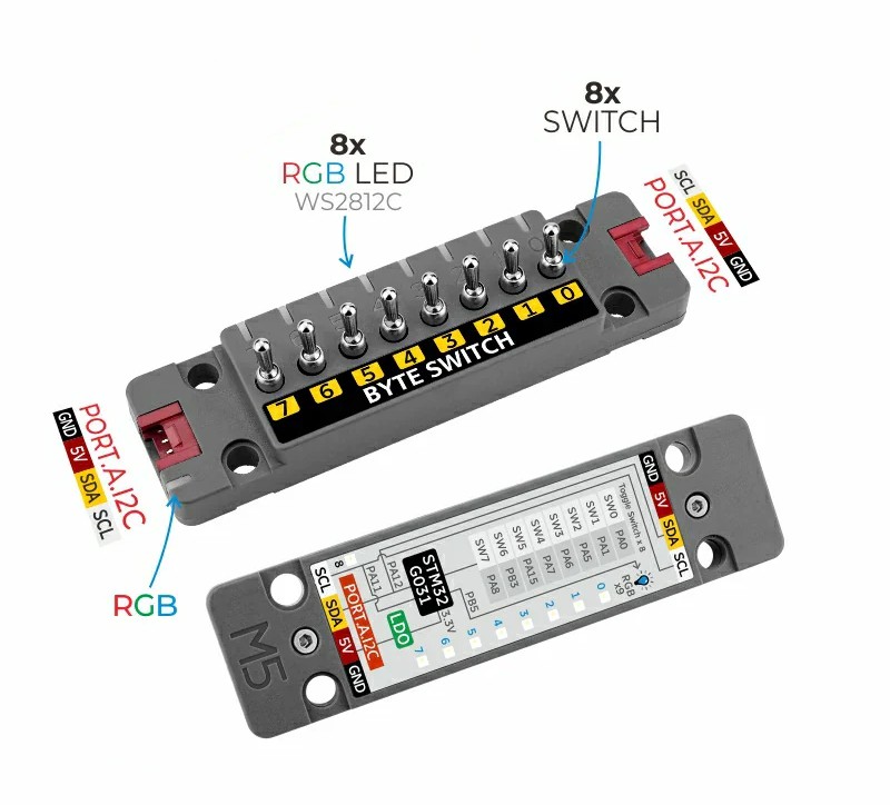 Unit ByteSwitch od M5Stack to zaawansowany moduł wejściowy zbudowany w oparciu o mikrokontroler STM32G031. Na płytce znajduje się 8 niezależnych przełączników bistabilnych oraz 9 diod RGB WS2812C, które mogą dynamicznie sygnalizować stan każdego wejścia. Dzięki komunikacji I2C oraz dwóm złączom Grove (Port.A), możliwe jest kaskadowe łączenie wielu modułów, co czyni go idealnym rozwiązaniem do rozbudowanych aplikacji z wieloma wejściami. Przeznaczony jest do współpracy z kontrolerami M5Stack i obsługiwany przez UIFlow oraz Arduino IDE.