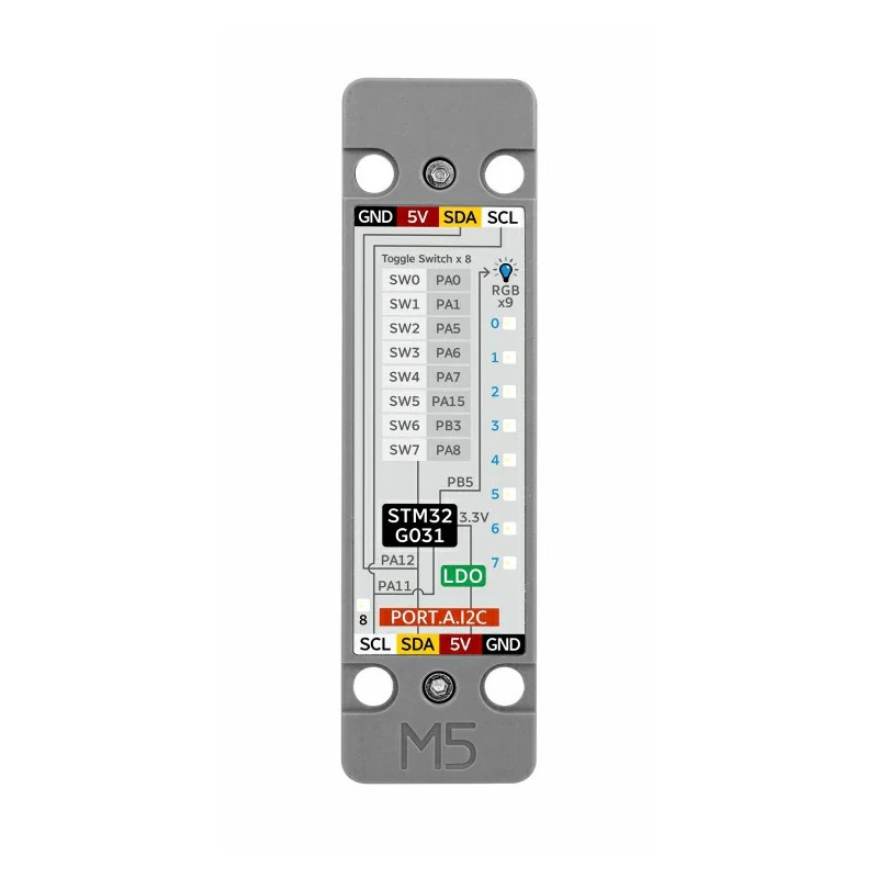 Opis produktu: ByteSwitch - 8 przełączników + 9 diod WS2812C RGB - STM32G031 - moduł rozszerzeń Unit - M5Stack U191