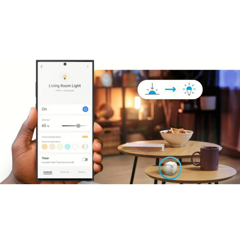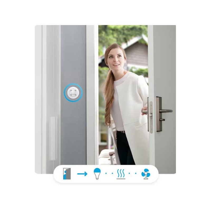 Zintegrowany czujnik PIR wykrywa ruch w zakresie do 10 m, umożliwiając automatyczne sterowanie oświetleniem, ogrzewaniem lub systemem alarmowym. Oferuje szeroki kąt detekcji wynoszący 120°, co pozwala na skuteczne monitorowanie nawet dużych pomieszczeń. Dzięki szybkiej reakcji urządzenie natychmiast uruchamia sceny i automatyzacje. Detekcja obecności pozwala zwiększyć bezpieczeństwo budynku oraz ograniczyć zużycie energii poprzez włączanie urządzeń tylko wtedy, gdy są potrzebne.