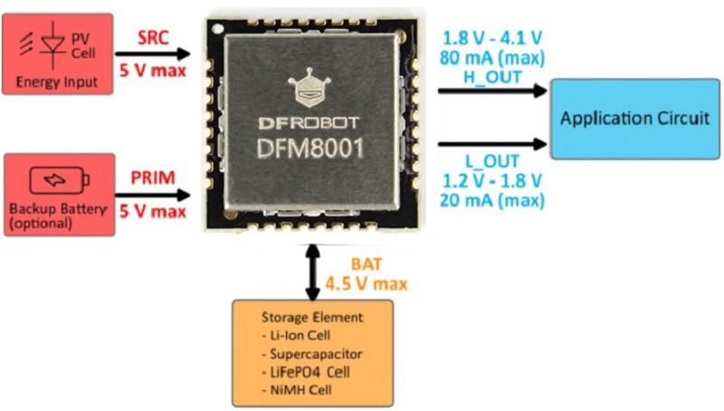 DFM8001 marki DFRobot to mikroenergetyczny moduł przeznaczony do zastosowań wewnątrz budynków, który umożliwia zasilanie urządzeń bez potrzeby stosowania akumulatora ani baterii. Pobiera energię z naturalnych źródeł - takich jak światło słoneczne, promieniowanie RF, energia cieplna czy mechaniczna - i efektywnie ją magazynuje. Dzięki zintegrowanemu zarządzaniu ładowaniem, rozładowywaniem i stabilizacją napięcia, jest idealnym rozwiązaniem dla bezobsługowych urządzeń IoT. Moduł oferuje również szeroką kompatybilność z ogniwami fotowoltaicznymi (w tym amorficznymi i organicznymi) i doskonale radzi sobie w warunkach słabego oświetlenia, np. w pomieszczeniach.