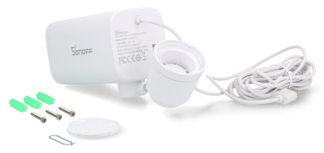 Sonoff CAM-B1P przeznaczona jest do montażu ściennego na elewacji budynku lub pod zadaszeniem. W zestawie znajdują się kołki oraz śruby montażowe, które umożliwiają stabilne zamocowanie urządzenia. Kamera zasilana jest napięciem 5 V / 2 A poprzez interfejs USB typu A. Konfiguracja odbywa się poprzez aplikację eWeLink po przytrzymaniu przycisku reset przez 5 sekund i połączeniu z siecią WiFi 2,4 GHz.