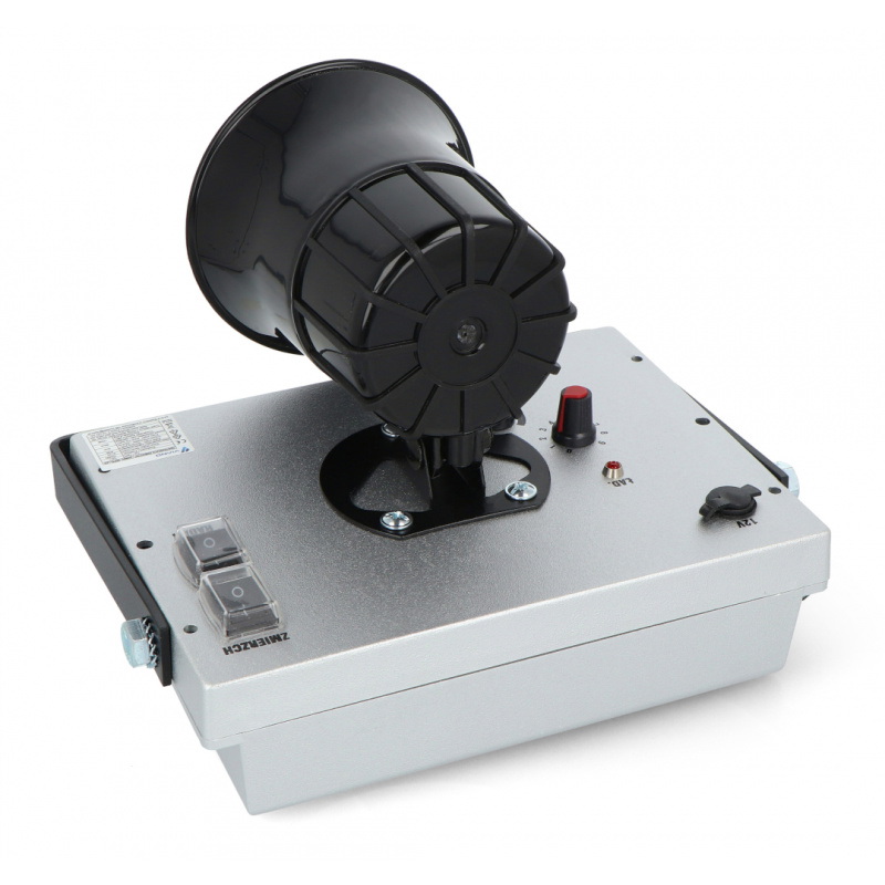 Odstraszacz Viano działa na zasadzie emisji głośnych dźwięków, które imitują syreny alarmowe, klaksony pociągów oraz sygnały ostrzegawcze statków. Dzięki temu urządzenie skutecznie płoszy dziki, sarny, ptaki i inne zwierzęta leśne. Aktywacja odtwarzania dźwięków odbywa się za pomocą radarowego czujnika ruchu, który wykrywa nawet najmniejsze zmiany w otoczeniu, co powoduje natychmiastowe uruchomienie sygnału dźwiękowego. Urządzenie oferuje dwa główne tryby pracy. W pierwszym trybie, detekcji ruchu, urządzenie aktywuje emisję dźwięków po wykryciu ruchu w obrębie czujnika radarowego. Dodatkowo można ustawić interwały czasowe, które pozwalają na emisję dźwięków w określonych odstępach czasowych. W drugim trybie, ciągłej emisji dźwięku, urządzenie działa niezależnie od detekcji ruchu, emitując dźwięki w zaplanowanych odstępach czasu. Odstraszacz może być zasilany zarówno bezpośrednio z sieci 230 V, jak i z akumulatora 12 V. Ta elastyczność pozwala na montaż urządzenia w różnych miejscach, niezależnie od dostępu do sieci elektrycznej. Dla uzyskania optymalnego zasilania w terenie, zaleca się używanie akumulatorów o pojemności 18 Ah lub większej, co zapewnia długotrwałą pracę urządzenia nawet w trudnych warunkach.