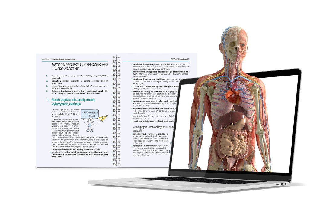 W pakiecie eduLabVR z goglami VR nauczyciele otrzymują autorski poradnik, który przedstawia zasady pracy projektowej z wykorzystaniem technologii VR. Poradnik jest przeznaczony dla początkujących oraz doświadczonych edukatorów, zawiera praktyczne wskazówki dotyczące organizacji zajęć i wykorzystania materiałów VR, umożliwiając efektywne wdrożenie wirtualnej rzeczywistości w codzienną praktykę szkolną.