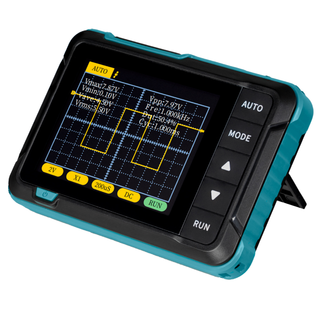 DSO-200 to nowoczesny, ręczny oscyloskop cyfrowy zaprojektowany z myślą o wygodzie i mobilności. Dzięki ergonomicznemu kształtowi oraz zintegrowanemu, składanemu stojakowi, urządzenie doskonale sprawdzi się zarówno na biurku, jak i w pracy w terenie. DSO-200 pracuje w paśmie 200 kHz z częstotliwością próbkowania 2,5 MS/s oraz szerokim zakresem czułości pionowej (od 10 mV/div do 20 V/div), co umożliwia precyzyjne pomiary sygnałów analogowych. Kolorowy ekran LCD o przekątnej 2,8" zapewnia czytelny podgląd przebiegów, a zasilanie z wbudowanego akumulatora litowego o pojemności 1000 mAh ładowanego przez USB typu C, umożliwia długą pracę bez potrzeby podłączania zewnętrznego źródła zasilania. Dodatkowo, DSO-200 oferuje różne tryby wyzwalania i sprzężenia sygnału, co czyni go idealnym narzędziem diagnostycznym do zastosowań edukacyjnych i serwisowych.