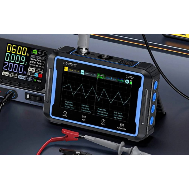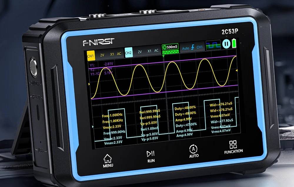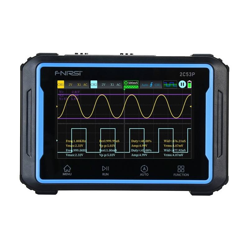 Opis produktu: Oscyloskop przenośny FNIRSI 2C53P 3w1 z mutimetrem i generatorem sygnału 50 MHz 2 kanały