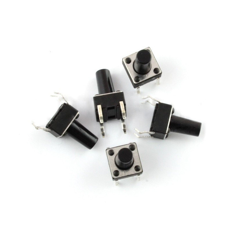 Oferujemy tact switche przewlekane o wymiarach 6 x 6 mm oraz wysokości 13 mm. W każdym zestawie znajduje się pięć sztuk czarnych switchy kwadratowych przeznaczonych do montażu THT (w technologii przewlekanej).