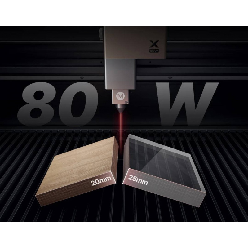 Dzięki mocy 80 W ploter radzi sobie z akrylem o grubości do 25 mm oraz drewnem do 20 mm w pojedynczym przejściu, co znacząco skraca czas produkcji.