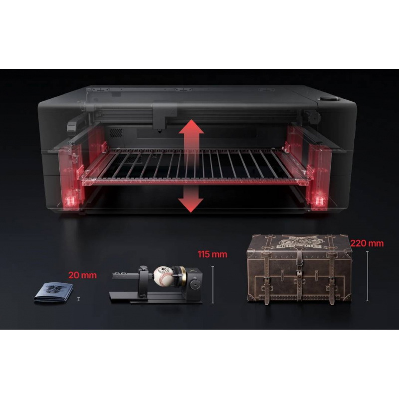 Zintegrowana baza AutoLift oferuje aż 220 mm prześwitu, co pozwala na grawerowanie na gotowych przedmiotach, takich jak walizki czy duże pudełka prezentowe, bez konieczności dokupowania osobnych podstaw.